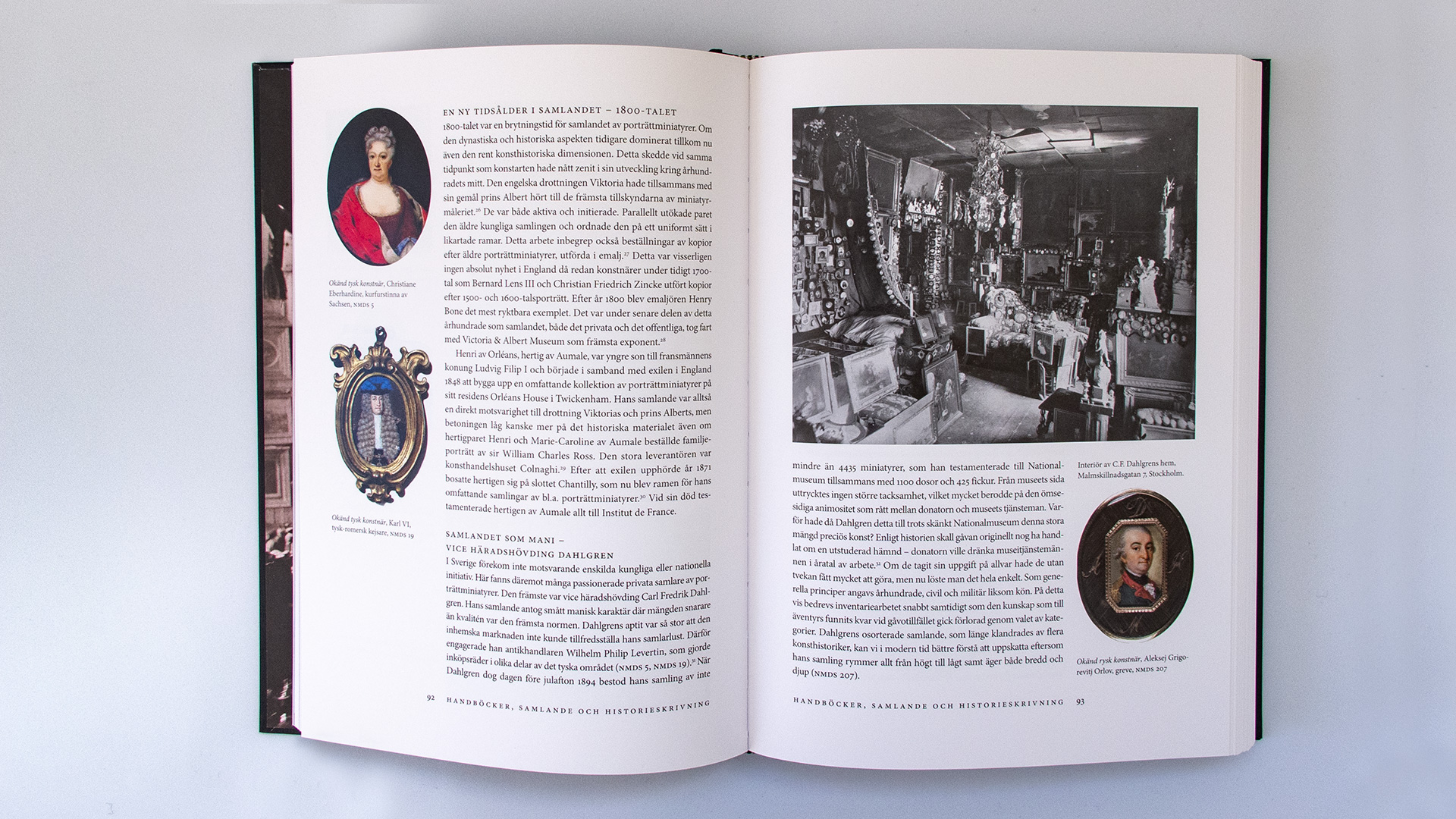 Trots detta har Nationalmusei miniatyrsamling förblivit okänd för många utanför fackkretsar. För första gången ges här en heltäckande presentation av museets stora innehav av miniatyrer, en kombinerad vägledning och historik, författad av Magnus Olausson, chef för Samlingarna. Det är samtidigt en översikt över miniatyrmåleriets historia där alla exempel är hämtade från Nationalmuseum. Förutom de betydande nationerna inom konstarten ägnas enskilda miniatyrister stort utrymme liksom olika aspekter såsom konstnärs- och beställarrollen, bruk och funktion samt material och teknik. Det sistnämnda partiet är författat av miniatyrkonservator Cecilia Rönnerstam. Boken innehåller mer än 700 färgbilder.